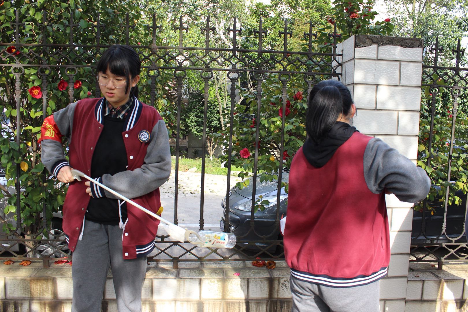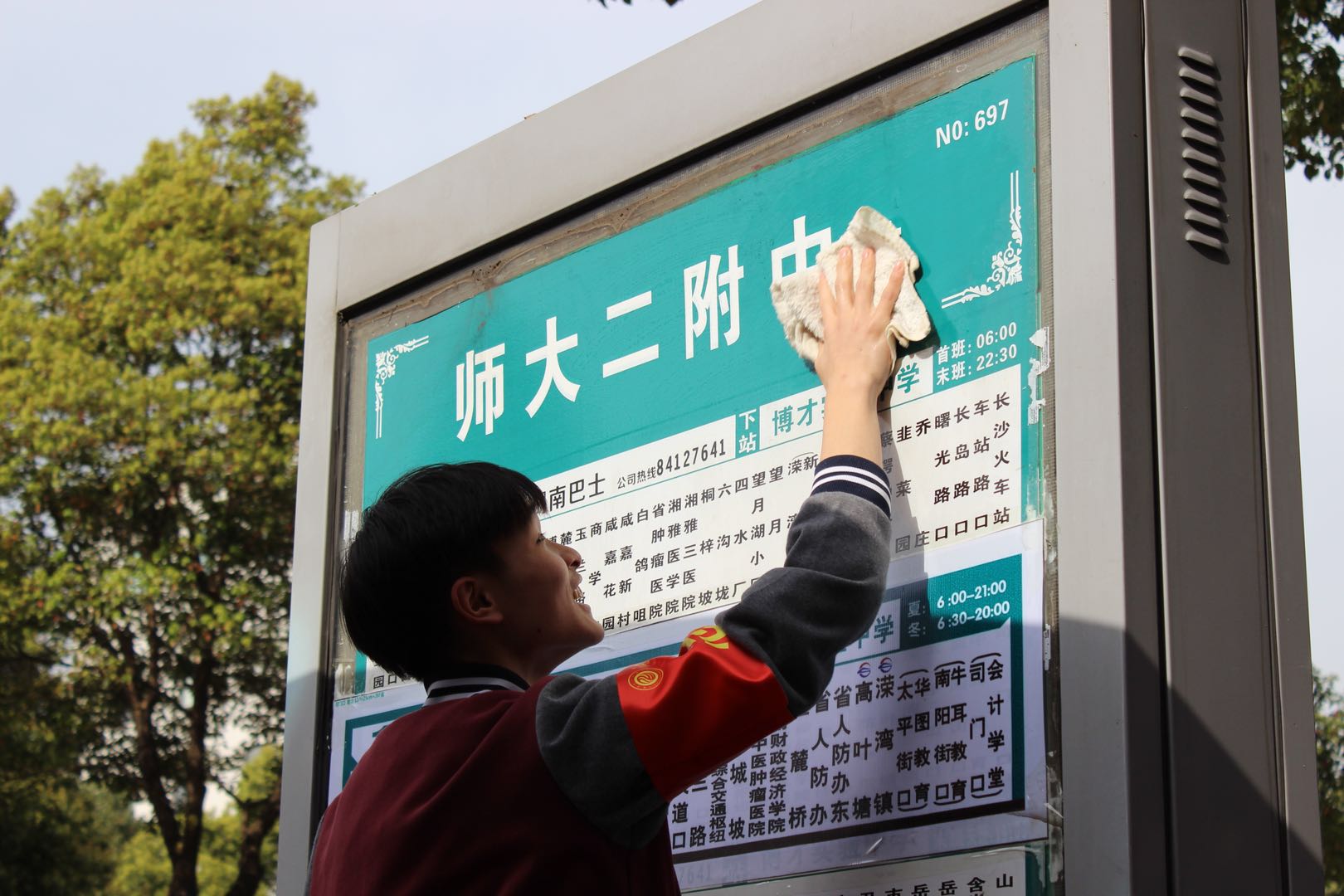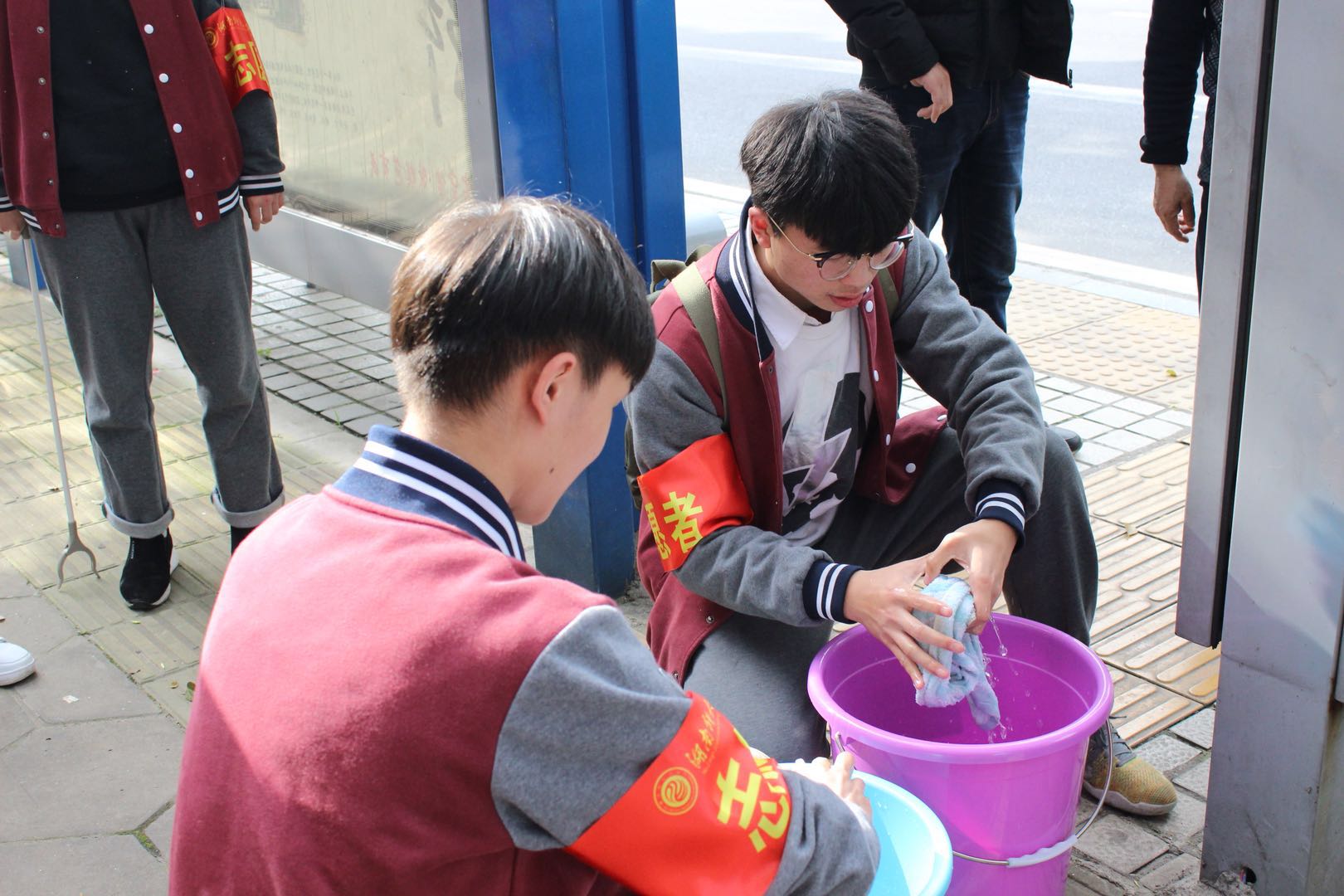 学生志愿者们在麓丰社区文明专干黄宇、团委书记王成老师的带领下,兵分几路,对街边广告展板、果皮纸屑、污泥积水、枯枝烂叶进行全面清理。学生们捡拾白色垃圾和落叶、清理擦拭公交站牌,打扫公共卫生,为城市卫生贡献自己的力量,也用实际行动向社会宣传了“蓝天保卫战”,带动更多人参与城市环保活动。