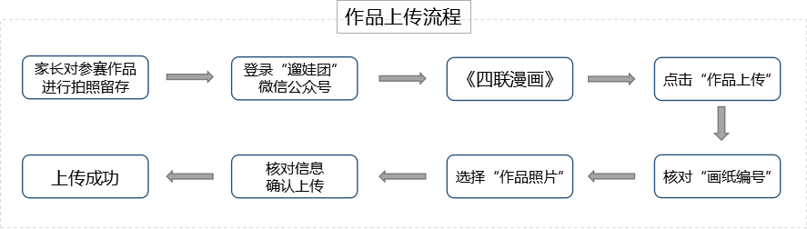 参赛选手作品创作完成后,由家长进行作品拍照/扫描,登录官方平台“遛娃团”微信公众号进行“作品上传”,根据提示及要求完成作品上传后,作品即可在线上展厅进行展览。